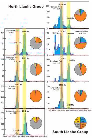 Due to the absence of volcanic rocks or pyroclastic components in the Langzishan Fm., its depositional age has long been a matter of debate. Some scholars argue that it formed between 2.05–1.93 Ga [12,44,48,84], while Xu et al. [27] propose an earlier depositional age of prior to 2.17 Ga. Based on zircon geochronology of aluminum-rich schist gneiss in the South and North Liaohe formations, Liu et al. [44] obtained an important age of ca. 1.95 Ga for the oldest metamorphic zircons in the Langzishan Fm. For the Li’eryu Fm., Wang et al. [88] reported a maximum depositional age from the South Liaohe Group based on the representative youngest individual zircon U-Pb ages of 2050 Ma. Furthermore, Xu et al. [27] compared the age distributions of detrital zircons and concluded that the deposition time of the Li’eryu Fm. was between 2.17–2.10 Ga. However, Chen et al. [100] concluded a geochronological study on acid volcanic rocks in the Liaoyang area and believed that there were three periods of magmatic activity in the Li’eryu Fm., i.e., 2190–2180 Ma, 2110–2100 Ma, and 1970–1960 Ma. Therefore, the previous deposition time of 2.05–2.1 Ga may represent the second period of Li’eryu Fm. magmatic activity, while the latest phase of magmatic activity should have been 1.95 Ga.