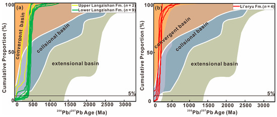 Detrital zircon ages vs. cumulative proportion diagrams for original basin settings of the Langzishan Fm. (a) and the Li’eryu Fm. (b) (Cawood et al., 2012 [119]).