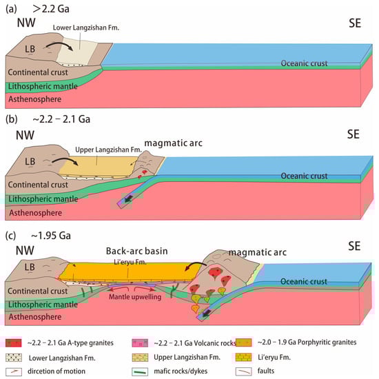 In summary, based on a combination of previous findings and our own new results, the present tectonic scenario is more consistent with initial back-arc extension along an active continental margin followed by arc-continent collision for the Paleoproterozoic JLJB. We propose a rough evolutionary model (Figure 13) that encapsulates the following statements. (a) During the period of ca. > 2.2 Ga, the southeastern margin of the LB was a passive continental margin, especially during the depositional period for the Lower Langzishan Fm. The basement rocks of the LB to the north were the primary sources for the deposition of the Lower Langzishan Fm. (Figure 13a). (b) Subsequently, in ~2.2 Ga, oceanic subduction began beneath the southeastern margin of the LB, leading to the formation of arc-affinity magmatic rocks (the Liao-Ji granites). As a result, the depositional environment transformed into an active continental margin, and a small amount of subduction-related monzogranite gneiss (~2.2 Ga Liao-Ji granite) likely contributed to the clastics in the Upper Langzishan Fm. (Figure 13b). (c) With the continuous subduction of the oceanic crust, it is possible that an increasing subduction rate or angle of the oceanic plate led to vertical slab roll-back and the contemporaneous extension of the active continental margin [125]. In around 2.2–2.0 Ga, a back-arc basin was initially formed. Accompanied by lithospheric extension and mantle upwelling, the partial melting of ancient crustal material, together with minor contributions of juvenile mafic rocks, generated widespread A2-type granitoids in the JLJB [27,54,55,90,120,121,122,123]. During this time, a large volume of volcanic clastics (boron-bearing), and debris derived from the magmatic arc, were rapidly deposited, forming the Li’eryu Fm. in around 1.95 Ga (Figure 13c). Importantly, the single peak of the detrital zircon age spectrum probably indicates intensive subduction activity during the deposition of the Li’eryu Fm. After that, the Gaojiayu, Dashiqiao, and Gaixian formations were extensively deposited in the back-arc basin. The provenance from the LB gradually increased, supplying ancient (~2.5 Ga) basement materials together with clastics from the magmatic arc (~2.2–2.0 Ga Liao-Ji granites), possibly because the subduction became relatively slow or the back-arc basin began to shrink. Finally, in around 1.87–1.85 Ga [10,20,27,90], the back-arc basin was closed and formed the JLJB.