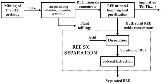 The separation of REEs is the last step of the valorization process of a REE ore as shown in Figure 1. All 15 (including Y but not Sc.) REEs are usually clustered in particular minerals such as monazite, bastnasite, or eudialyte [1] and they remain clustered during the mining and ore concentration processing steps that aim at producing a concentrate of REE minerals. The REEs are «de-clustered» at the hydrometallurgical step, which is aimed at: