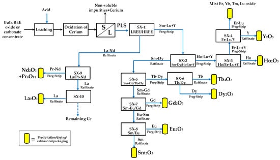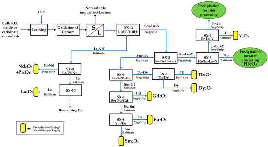 Possible REE separation scheme to obtain 9 individual REEs and two bulk REE products. (Note: Case where cerium is mostly removed prior to the SX plant.)
