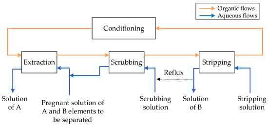 As indicated above, during the extraction step, unwanted elements also transfer into the organic phase. This is the case for elements A for the A/B separation in Figure 3. These unwanted elements form less stable complexes with the extractant than the targeted elements and can be removed from the organic phase by contacting the loaded organic phase with a slightly acidic aqueous solution (the scrubbing solution) in order to push the reaction of Equation (1) toward the left, i.e.,