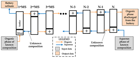 A battery of MS consists of a cascade of N mixer-settlers that exchange the discharge of adjacent settlers. The difficulty associated with the simulation of a MS battery is related to the fact that the aqueous solution is flowing counter current to the organic phase, as shown in Figure 5, in order to maximize the concentration gradient between the exchanged species [31,32]. In this counter current scheme, the composition of the organic phase entering the battery is known, and it is contacted with the raffinate of the second MS of the battery whose composition is unknown, so the first MS of the battery cannot be simulated by the above procedure. The same difficulty arises for the Nth MS of the battery that is fed by an aqueous solution of known composition and the organic solution discharged from the N-1th MS of the battery that has an unknown composition. Despite this difficulty, the problem of simulating a battery of MS is perfectly defined with the same number of equations and unknowns.