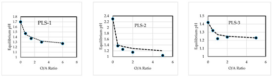 Figure 7 shows the observed and predicted equilibrium pH obtained for the tested O/A ratios from Table 4. The simulated equilibrium pH is calculated with Equation (11). As the pH is an indirect measurement of the quantity of extracted REEs, it can be expected that the predicted extractions will be consistent with the observed ones. This can be verified in Figure 8 for the three PLS of Table 4.