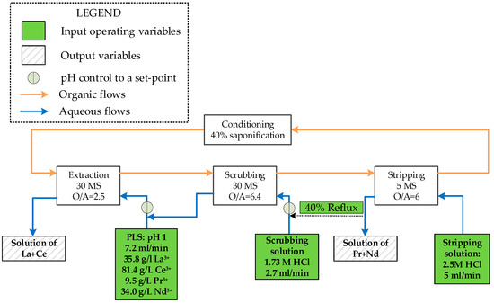 The simulator is used here to illustrate an example of pre-screening the operating conditions for the La-Ce/Pr-Nd separation circuit of Figure 9. The composition of the feed solution is given in Figure 9. P507 is the extractant in a 50% v/v concentration in sulfonated kerosene as diluent. The assessed design and operating variables or factors are identified in Table 7 with the tested values and the simulated purity indices. For the sake of brevity, only nine conditions (the analysis excluded the O/A ratio in the three batteries, the extractant concentration in the organic phase, the reflux proportions, the number of MS, and the acid concentration for the stripping) are tested here. Four parameters or factors are modified (the pHs of the PLS and the scrubbing feed solution and the numbers of MS units in the extraction battery and the scrubbing battery). Other parameters, such as the extractant concentration and the O/A ratio, were kept constant to simplify the analysis. The raffinate from the scrubbing stage is completely returned and mixed with the PLS in the extraction stage. No reflux from the stripping to the scrubbing is used, while in practice, a significant saving of acid is possible by this reflux that can readily be simulated with the developed simulator.