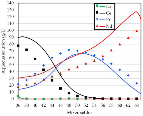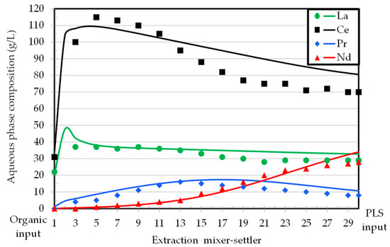 The simulation results for the scrubbing battery are shown in Figure 11. The fit between observed and simulated results is good, even though the pH of the scrubbing solution is not explicitly provided by the authors of [9] who indicated having modified the acidity of the scrubbing solution from 3.5 M, to 2.3 M, and to 1.3 M HCl during the 25 days pilot trial (the simulation assumed 1.73 M HCl). The agreement between the observed and simulated results was achieved without the need to adjust the equilibrium constants that were estimated from independent batch extraction tests; a result that still supports the hypothesis of ideal solutions on the basis of the simulation approach. The discrepancy observed for Nd and Pr is due to the reflux from the stripping for which the authors [9] did not provide the actual proportion used during piloting.