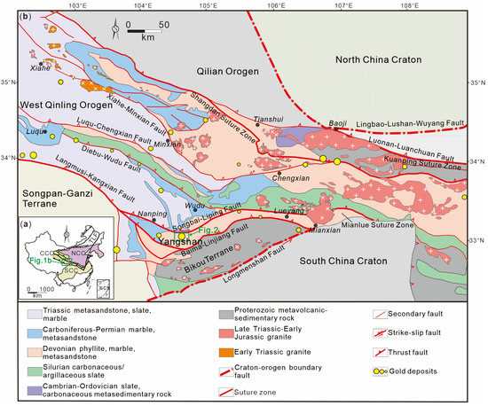 Simplified geological map of the West Qinling Orogen, showing the distribution of major crustal blocks, fault systems, and Mesozoic granitoids [16]. CCO, Central China Orogen; M, Mianlue; NCB, North China Block; SCB, South China Block; SCS, South China Sea; TLF, Tancheng–Lujiang Fault. (a): Tectonic overviews showing the position of West Qinling Orogen. (b): Schematic map showing the tectonic setting and distribution of gold deposits in West Qinling.