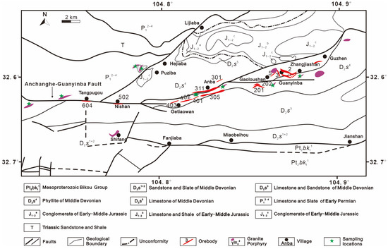 The Yangshan gold belt is situated between the Yangtze Plate, the North China Plate, and the Songpan-Ganzi orogenic belt, creating an “inverted triangle” geotectonic position. The geographical coordinates are: East longitude: 104°29′30″–105°00′00″; North latitude: 33°00′30″–33°10′00″ (see Figure 1) [1,2,12,13,14,15,16]. The regional stratigraphy ranges from Mesoproterozoic to Quaternary, including the Mesoproterozoic Bikou Group, found in the southeastern part of the area in the Motianling thrust tectonic zone. This group is primarily composed of shallow metamorphic volcanic-sedimentary rocks consisting mainly of tuffs, dolomites, and sandstones. Devonian strata are widely exposed and consist of a series of giant thick shallow marine clastic mudstone-carbonate sedimentary rocks. Carboniferous crops outs are around the Wenxian arc tectonic zone and comprise a series of coastal shelf-phase carbonate sedimentary formations, mainly thick layered limestone. Rocks of Permian are located in the northwest and southwest of the region and consist of marine carbonate rocks and normal sedimentary clastic rocks, primarily composed of tuffs, dolomitic tuffs, and sandstones. The Triassic period is also represented in the study area and includes coastal and shallow marine terrestrial clastic rocks with a small amount of carbonate rocks, primarily sandstone and sandy shale. The Jurassic series is found in the Puziba-Qiaotou-Moba area and consists mainly of red sandy conglomerate sediment. In addition, there are large exposures of Cenozoic-Tertiary loess and Quaternary alluvial deposits [3,17,18].