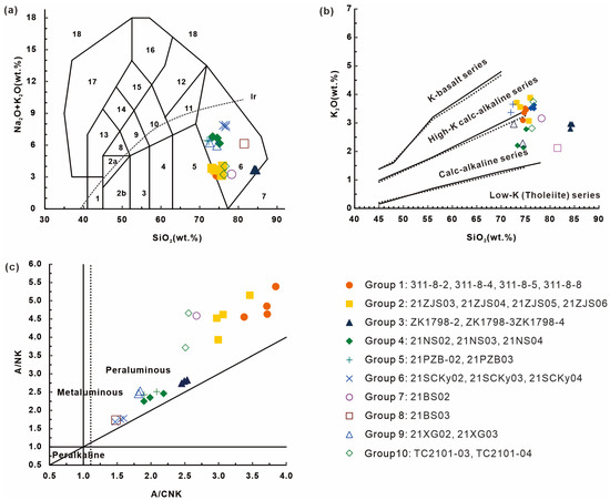 (Na2O + K2O) vs. SiO2 (a), after Middlemost, 1994) [34]; K2O vs. SiO2 (b), after Rollinson, 1993) [35]; A/CNK vs. A/NK (c), [36]). (a), Ir: Irvine boundary, with alkaline above and subalkaline below. 1—olivine gabbro; 2a—syenogabbro; 2b—gabbro; 3—gabbro–diorite; 4—diorite; 5—granodiorite; 6—granite; 8—alkali–gabbro; 9—alkali–gabbroicdiorite; 10—syenodiorite; 11—quartz monzonite; 12—syenite; 13—feldspathoid gabbro; 14—feldspathoid monzonite diorite; 15—feldspathoid monzonitic syenite; 16—feldspathoid syenite; 17—foidite pluton; 18—leucite rock.