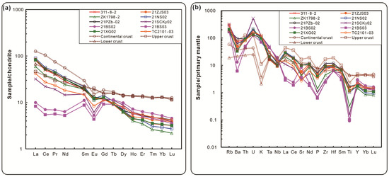 (a) Chondrite-normalized rare earth element (REE) patterns, (b) Primitive mantle–normalized spider diagram (chondrite(C1); primary mantle data is taken from Sun et al. (1989) [37], continental crust, upper crust, lower crust data is taken from Taylor et al. (1985) [38]).