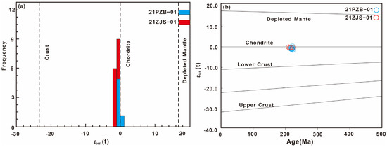 Lu-Hf isotope analysis was conducted on 16 zircon samples (sites) from the 21PZB-01 and 21ZJS-01 specimens, and the data are presented in Table A3. All zircon sites have 176Lu/177Hf ratios within the range of 0.000286 to 0.001655, which preclude the significant accumulation of radiogenic Hf after their formation. Thus, the measured 176Hf/177Hf ratios signify the Hf isotopic composition at the time of zircon formation. εHf(t) values range from −1.5 to 0.1(t), and most of the test points are located near the evolution line of chondrites (Figure 8). The age range for the mantle model (TDM1) can be estimated to be 859–937 Ma, whereas the range of crustal model ages (TDM2) is 1111–1218 Ma.