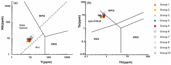 We analyzed 25 samples of different lithologies from various sampling locations, which were distinguished into ten groups. The concentrations of major and trace elements were employed to differentiate the samples based on their tectonic position and petrogenetic type [51,52]. Figure 11a shows that the granitic porphyries consistently fall within the Slab failure field in the Nb-Y plot, while they form a cluster in the Syn-COLG and WPG ranges in the Ta-Yb plot (Figure 11b).