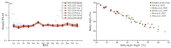 - Wei, W.; Chen, X.; Yu, Z.; Chen, W.; Fang, Q.; Tang, X.; Ling, H. Different hydrothermal fluids inducing alteration and uranium mineralisation in the Baquan deposit of the Xiangshan uranium ore field: Constraints from geochemistry of altered rocks and ores. Ore Geol. Rev. 2021, 139, 104475. [Google Scholar] [CrossRef]