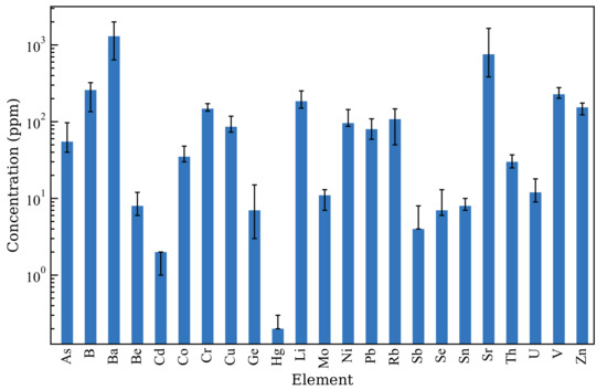 Among the types of ash generated, coal fly ash (CFA) constitutes 65%–90% of the total ash volume, with an annual generation of over 1 billion metric tonnes [2]. A total of 40% of the CFA produced worldwide is not utilised to end up in landfills, disposal ponds, and elsewhere, leading to environmental, social, and economic concerns [3,4]. The properties of CFA are significantly influenced by the properties of the parent coal and combustion conditions. Typically, CFA is a fine spherical material primarily composed of SiO and AlO, containing both crystalline and amorphous phases, with over 50% of the total composition being amorphous. The amorphous phase is more reactive to acids and alkaline solutions, whereas the crystalline phase requires high-temperature and high-pressure conditions [5,6]. Table 1 provides a description of the major chemical compositions of CFA worldwide, whereas Figure 1 describes the distribution of trace element concentrations in CFA according to Moreno et al. [7]. The variations in the chemical composition is influenced by the type of parent coal and boiler conditions at the thermal power plant [8]. The pH of CFA varies from 1.2 to 12.5, which is largely attributed to the Ca/S molar ratio of CFA. Additionally, other minor alkaline cations, such as Na, Mg, K, and Mn, also contribute to alkalinity [9,10,11]. Although the majority of CFA particles are spherical silica and alumina components, irregular silica and alumina particles, Ca crystals, and unburnt carbon are also present. CFA particles generally range from a few nanometres to 500 μm in diameter [12]. A summary of the physicochemical properties of the CFA is presented in Table 2. The diversity in the properties exhibited by CFA renders it a notably challenging material to characterise, as its properties can differ across regions and even within the same region.