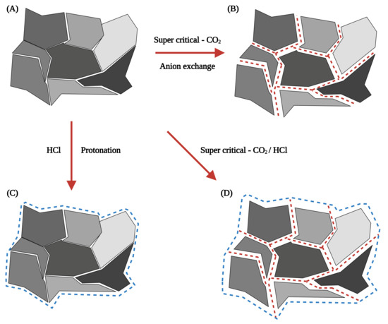 Schematic diagram of individual effects of super critical-CO (A,B) and HCl (A–C), as well as their combined effect (A–D) on the mineral components of CFA [86].