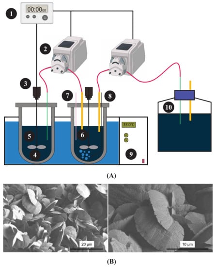 (A) Schematic diagram of a custom-made automatic bioreactor from the study of Zhang et al. [115]. Here 1—timer, 2—pumps, 3—motors, 4—shaft and impeller, 5—feeding vessel, 6—bioleaching vessel, 7—pH/Eh portal, 8—glass gas sparger, 9—water bath, and 10—leachate reservoir. Adapted from Zhang et al. [115] (B) Scanning electron microscopy (SEM) images of the REE precipitate [115].