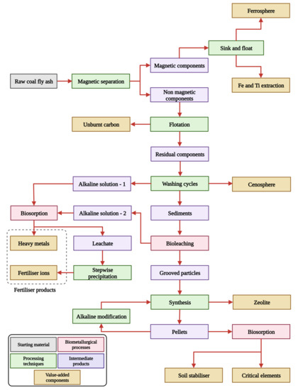 A prospective flowsheet for the multi-component utilisation of the CFA achieved by replacing high-energy combustion methods of processing with the biometallurgical processes.