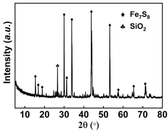 Clearly, Table 1 reveals that the pyrolysis slag is primarily composed of Fe, S, Pb, and Zn, where Fe accounts for 54.26% of the total composition, followed by S at 36.70%, Pb at 0.78%, and Zn at 0.36%. The XRD pattern of the pyrolysis slag in Figure 1 indicates that the main iron-bearing phase is pyrrhotite.