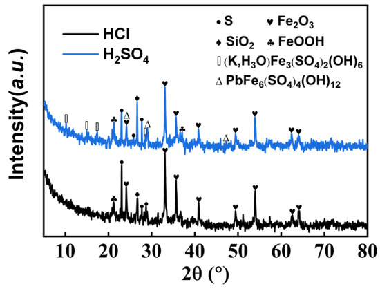 XRD patterns of the hydrochloric acid and sulfuric acid on red pressure leaching residue.