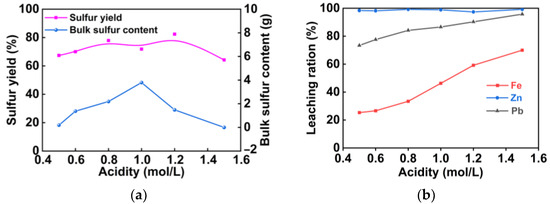 The effect of the initial acidity on oxygen pressure leaching of pyrrhotite: (a) sulfur yield and bulk sulfur content; (b) leaching ratios of Fe, Pb, and Zn.