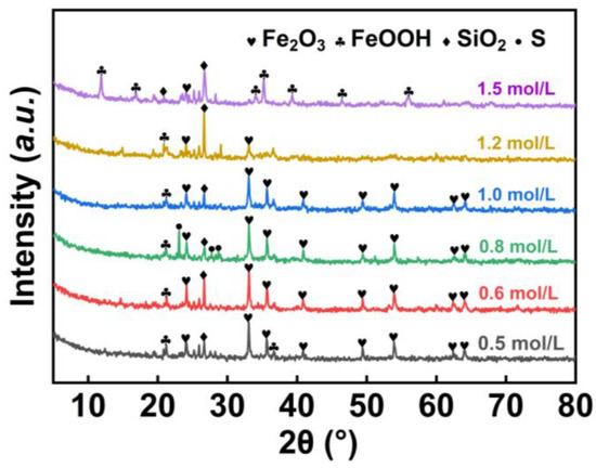 As shown in XRD patterns (Figure 5), pyrrhotite peaks are absent at a 0.5 mol/L acidity, indicating successful leaching of pyrrhotite at a low pH. Upon increasing the acidity, peaks of hematite become more prominent. As the acidity increases beyond 1 mol/L, hematite peaks diminish and goethite peaks rise. Thus, an initial acidity of 0.8 mol/L was selected to minimize the iron leaching and to optimize the sulfur yield. The results show that, under this acidity, the sulfur yield was 78.4% with 2.6 g of bulk sulfur, and iron leaching was 33.4%, while the lead and zinc leaching were 84.1% and 99.0%, respectively.