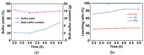 The effect of the leaching time on oxygen pressure leaching of pyrrhotite: (a) sulfur yield and bulk sulfur content; (b) leaching ratios of Fe, Pb, and Zn.