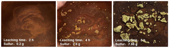 It can be seen that the viscosity of the slurry was too high when the liquid-to-solid ratio was 3:1 (Figure 15a), which was not conducive to the mass transfer since an agglomeration phenomenon was observed (Figure 16), where the sulfur yield and the bulk sulfur content were both low. Clearly, a decrease in the viscosity of the slurry could improve the sulfur yield and bulk sulfur content as the liquid-to-solid ratio increased. Moreover, the liquid-to-solid ratio of 9:1 only achieved bulk sulfur, and negligible changes were observed in the sulfur yield and the bulk sulfur production when the liquid-to-solid ratio was further increased. In the meantime, the acid content gradually increased as the liquid-to-solid ratio increased (Figure 15b), and the leaching ratios of iron and lead continued to rise. However, an excessive liquid-to-solid ratio was not conducive to the recovery of iron elements.
