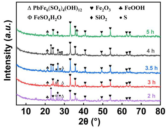Figure 6a and Figure 7 displayed that the leaching time has a significant effect on the formation of the bulk sulfur. Clearly, no bulk sulfur was formed when the leaching time was 2 h, indicating that the leached elemental sulfur has not yet condensed into a solid block. As the leaching time increased, the liquid sulfur gradually accumulated into a solid block, leading to an increase in the content of bulk sulfur. With a leaching time of 5 h, the bulk sulfur content exceeded 7.86 g, and the sulfur yield reached 80.84%, where the sulfur quality obtained under these conditions was the best. According to Figure 6b, the leaching ratio of iron remains at approximately 33% as the leaching time increased from 2 to 5 h, and that of the lead remained between 70% and 85%, while that of the zinc remained at around 99%. It can be observed from the XRD pattern in Figure 8 that when the leaching time was short, iron may exist partially in the form of jarosite [i.e., KFe3(SO4)2(OH)6], with other impurities. Especially at 5 h, the peaks of Fe2O3 in the XRD pattern are mostly consistent with the standard pattern, and the impurity peaks were less pronounced. Therefore, a leaching time of 5 h was considered to be the optimal condition.