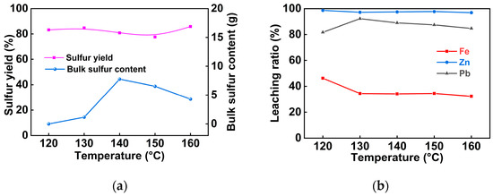 The effect of the leaching temperature on oxygen pressure leaching of pyrrhotite: (a) sulfur yield and bulk sulfur content; (b) leaching ratios of Fe, Pb, and Zn.