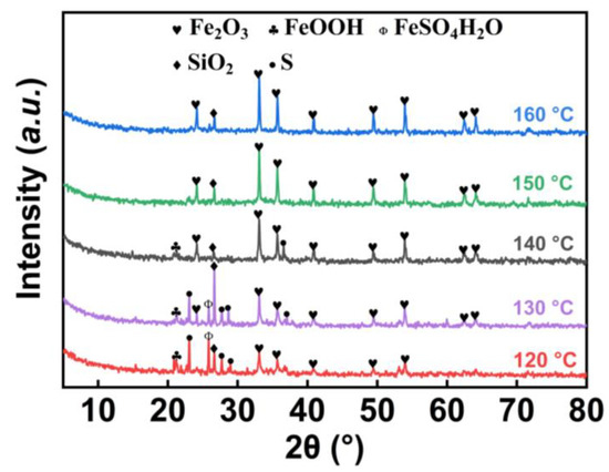 Figure 11 displays the XRD patterns of the red pressure leaching residue obtained at various temperatures. Through a close inspection of all the XRD results, it is found that the intensity of the hematite peak and the crystalline purity increased as the temperature increased. Additionally, the area of the hematite peaks gradually enlarged, while the spurious peaks of other iron phase compounds diminished. After a comprehensive evaluation, a leaching temperature at 150 °C was demonstrated to be an optimal value, where the sulfur yield was 78.1%, the bulk sulfur yield was 6.56 g, the leaching ratio of Fe was only 34.4% and the iron loss was minimized.