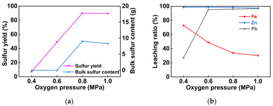 The effect of oxygen pressure on oxygen pressure leaching of pyrrhotite: (a) sulfur yield and bulk sulfur content; (b) leaching ratios of Fe, Pb, and Zn.