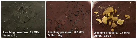 It can be seen in Figure 12a and Figure 13 that when the oxygen pressure is 0.4 MPa, it is not enough to leach sulfur, which enables a quite low sulfur yield, and the residue was black, indicating that almost no hematite was generated. With the continuous increase in oxygen pressure, the sulfur yield and bulk sulfur gradually increased. At 0.8 MPa, the sulfur quality was the best, which was quite easy to be separated from the red residue. Figure 12b shows that the leaching ratio of iron gradually decreases with oxygen pressure, and iron was gradually oxidized into hematite. When the oxygen pressure was 0.4 MPa, the leaching ratio of iron reached 72.83%, which indicated that the acid is basically used to decompose pyrrhotite, while the PbS was difficult to be leached with a value of only 27.71%. Furthermore, the oxidation of iron ions continued with the increase in oxygen pressure. According to Equations (1) and (2), the oxidation process of iron would produce acid, which increased the leaching ratio of lead.