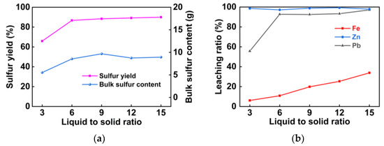The effect of liquid-to-solid ratio on oxygen pressure leaching of pyrrhotite: (a) the sulfur yield and bulk sulfur content; (b) the leaching ratios of Fe, Pb, and Zn.
