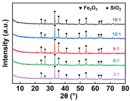 It can be observed from the XRD patterns in Figure 17 that the hematite peaks in the red residue were the strongest ones and the miscellaneous peaks were the lowest, suggesting that the content of hematite in the red residue was quite high, which was close to a value of over 90%. It is thus believed that the optimal liquid-to-solid ratio was 9:1.