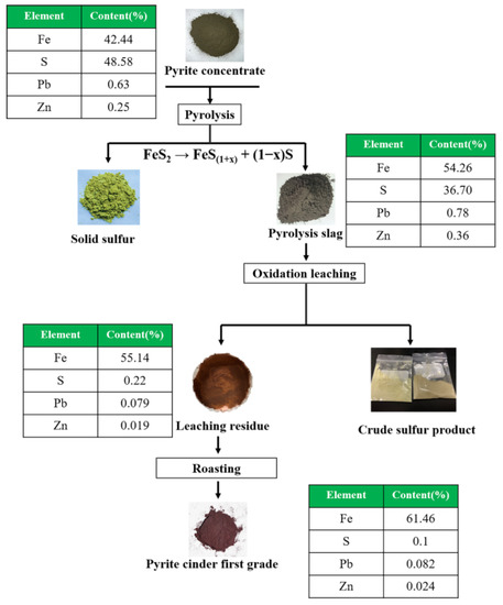 Pyrite concentrate (FeS2) is an important by-product obtained from sulfide ore flotation, which is mainly used to produce sulfuric acid [1,2]. The pyrite concentrate obtained from lead–zinc flotation contains high levels of impurity elements (e.g., lead and zinc), which pose a serious problem for the traditional acid-making process. Moreover, the current surplus in the sulfuric acid market has limited the sales of sulfuric acid, resulting in a large accumulation of pyrite concentrates [3]. Due to its high impurity content, pyrite slag produces complex iron phases that are harmful to subsequent iron refining processes, rendering it effectively unusable [4,5,6]. Although different methods (e.g., magnetic separation, gravity separation [7], flotation [8], and magnetic roasting [9]) have been developed to recover iron from pyrite slag, they suffer from high energy consumption and production costs [10], and it is difficult to reduce impurity elements to the required level in the final product. This leads to poor comprehensive utilization of iron and sulfur resources, and significantly reduces the value of pyrite concentrate [11,12,13]. Moreover, the traditional roasting method for acid production normally generates flue gas and roasted slag from long-term storage, which could lead to serious environmental issues [14,15]. Therefore, developing a green and efficient way to realize the high-value utilization of pyrite concentrate has never been more imperative.