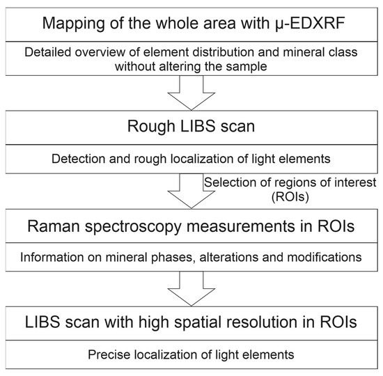 Our approach presented in this paper is based on four steps (Figure 1). First, the whole area is mapped with µ-EDXRF to obtain an overview image of the element distribution and the mineral classes with high spatial resolution without altering the mineral phases. Afterwards, a LIBS scan with a sampling point distance of a few hundred micrometers is performed on the whole area to roughly localize the light elements. The distance between the points is necessary to leave enough undisturbed area for a subsequent investigation with Raman spectroscopy. The elemental maps obtained from the µ-EDXRF and rough LIBS scans are then used to select areas of interest for further investigations with Raman spectroscopy and also LIBS. Raman spectroscopy is used to obtain information on the mineral phases, and the subsequent LIBS scan with high spatial resolution enables a fine localization of the light elements. Our results obtained for two different rock samples show the feasibility and potential of the proposed method.