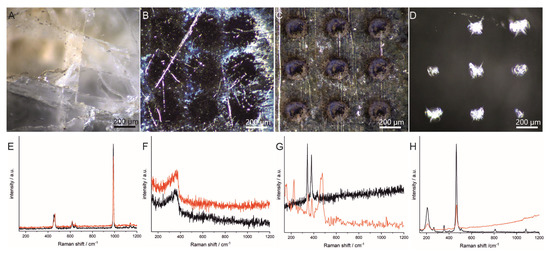 (A–D) Micrographs of four different minerals after the LIBS experiment (3 mJ, 1 pulse); (E–H) Raman spectra before (black) and after (red) the LIBS experiment (λ = 532 nm, I = 6.4 × 105 W·cm−2). (A,E) Barite; (B,F) fahlore; (C,G) pyrite; (D,H) quartz.