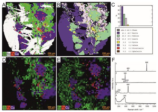 Results of the mapping of the whole fahlore sample with µ-EDXRF and LIBS and the single-point analysis with Raman spectroscopy. (A) µ-EDXRF and (D,E) LIBS mapping showing the element distribution of barium, copper, iron and silicon in false color. The orange rectangle in (A) shows the area in which the fine Raman–LIBS scan was performed. (B) Spectral angle mapper (SAM)-based supervised mineral classification with (C) mineral partitioning as a result of the µ-EDXRF mapping. (F) Raman spectra obtained by single measurements on the points marked in black in image (A). The Raman spectra can be assigned to the following mineral phases: (1) barite; (2) pyrite; (3) quartz; (4) fahlore.