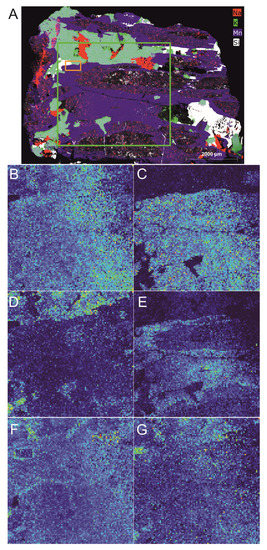 Information about the elemental content of individual minerals can be helpful for characterizing the type of a certain deposit. In addition, a characterization of the mineral phases is useful because they can have very different physical properties (e.g., melting points, hardness, etc.). Moreover, such information is important to understand fundamental geological processes. So far, optical microscopy, scanning electron microscopy-based automated mineral analysis, electron probe microanalysis (EPMA) and, recently, micro energy-dispersive X-ray fluorescence (µ-EDXRF) analysis-based automated mineralogy are standard techniques for such tasks [1,2]. The advantage of µ-EDXRF is the fast delivery of information about the elemental composition and texture without altering the sample. The EDXRF spectra can be related to certain minerals by a classification using the spectral angle mapper (SAM) algorithm. Even the chemical zonation of individual minerals can be highlighted in a very detailed way [3,4]. However, it has some limitations. Diffraction signals might obliterate some information. This effect on mineral classification can be minimized by calculating the minimum signal per channel and per pixel from two detectors. Furthermore, EDXRF is not able to detect light elements (e.g., lithium and boron), and the count rates for carbon, fluorine and sodium are very low. In a well-described paragenesis where all minerals are known, unidentified elements, such as lithium, beryllium, boron etc., will not hinder the correct attribution to a mineral such as tourmaline or lepidolite, but any further subdivision based on the lithium and boron content in the sample will not be possible. Therefore, in unknown systems, automated EDXRF classification might reach its limits.