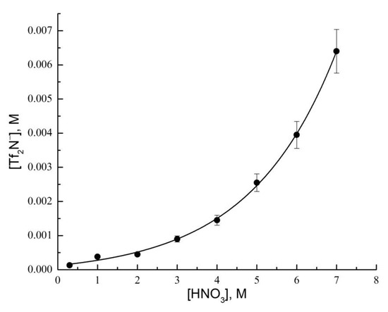 In order to evaluate the transfer of [N1888][Tf2N] components into an aqueous phase during the extraction of metal ions, the distribution of Tf2N− ions between IL and aqueous solutions of nitric acid was considered. An increase in the HNO3 concentration in the aqueous phase leads to an increase in the Tf2N− concentration in the aqueous phase, meaning an increase in the IL transition into the aqueous phase (Figure 1, Table S1). This may be due to the formation of IL with nitrate ions, which have a significantly lower hydrophobicity than Tf2N− ions. In the case of IL [N1888][Tf2N], the process of equilibrium can be described by the equation