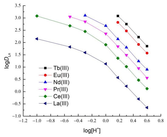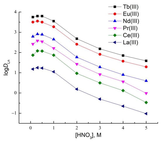 The nature of the logDLn-log[HNO3] dependence changes sharply upon extraction with DGA solutions in ILs. The effect of the HNO3 concentration in the equilibrium aqueous phase on the extraction of Ln(III) ions with TODGA into [N1888][Tf2N] is shown in Figure 2 (Table S2). An increase in the concentration of HNO3 in the aqueous phase is accompanied by a decrease in the distribution ratios of Ln(III). A similar dependence of D on the acidity of the aqueous phase was previously observed during the extraction of Ln(III), alkaline earth metals, and U(VI) with neutral DGA extractants [32,33,34,35] dissolved in imidazolium ILs, as well as the extraction of Eu(III) with T2EHDGA into [N1444][Tf2N] [44].