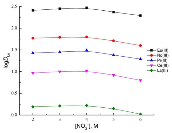 It follows from this equation that, formally, the efficiency of the Ln(III) extraction does not depend on the concentration of HNO3 in the aqueous phase. However, the effect of the concentration of H+ and NO3− ions in the aqueous phase is significantly different. As can be seen from the data in Figure 3 (Table S3), at a constant acidity of the aqueous phase, an increase in the concentration of NO3− ions in the aqueous phase does not lead to a significant change in the Ln(III) distribution ratios. Some decrease in DLn with an increase in the concentration of nitrate ions can be due to a shift in equilibrium (1) to the right, leading to an increase in the concentration of [N1888][NO3] in the organic phase. Consequently, there will be an increase in the concentration of N1888+ ions in the aqueous phase, leading to a shift in equilibrium (3) to the left and, consequently, a decrease in DLn.