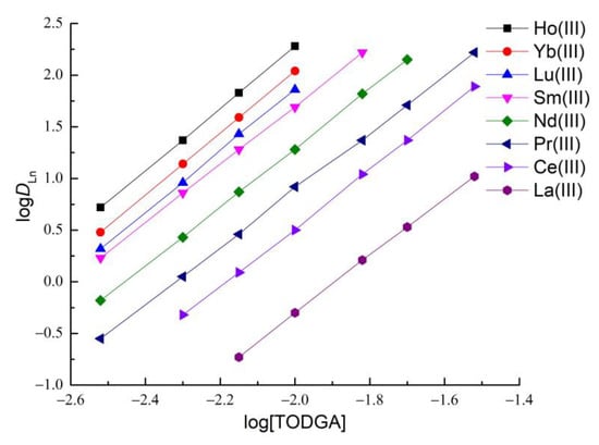 In order to determine the stoichiometric ratio of Ln(III): TODGA in the extracted complexes, the dependence of the distribution ratios of Ln(III) on the concentration of TODGA in IL during extraction from aqueous solutions with a constant concentration of nitric acid was studied. The plot of logDLn vs. log[L] shows straight lines with a slope close to 3 (Figure 5, Table S5). This indicates that three TODGA molecules are coordinated to Ln(III) ions in the IL phase. Similar results were obtained for the extraction of Eu(III) with T2EHDGA into [N1444][Tf2N] ionic liquid [44].