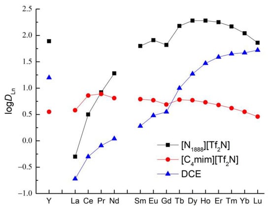 It was previously established that the addition of even small amounts of [C4mim][Tf2N] to a solution of DGA ligands [37,38,39] in conventional molecular diluents leads to a significant increase in the efficiency of the extraction of Ln(III) ions. This effect was associated with the high hydrophobicity of the IL anions, Tf2N−, which are involved in the formation of extractable complexes as counterions. Therefore, in this work, we consider the effect of [N1888][Tf2N] on the extraction of Ln(III) ions with solutions of TODGA in molecular organic diluents.