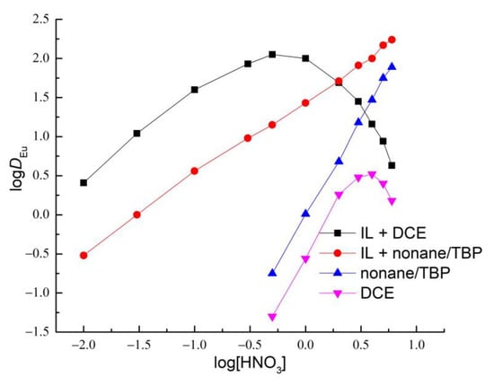 The effect of HNO3 concentrations in the aqueous phase on the extraction of Eu(III) with 0.01 M solutions of TODGA in DCE, nonane, containing 1.1 M TBP, and in DCE, nonane, containing 1.1 M TBP in the presence of 0.1 M [N1888][Tf2N]. The sizes of the points represent error bars.