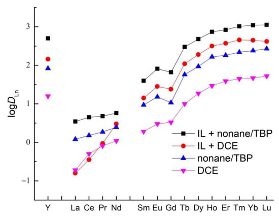 The data on the Ln(III) extraction from a 3 M acid solution with solutions of TODGA in DCE and nonane containing 1.1 M TBP in the presence of 0.1 M [N1888][Tf2N] are shown in Figure 10 (Table S10). It can be seen from these data that the distribution ratios of Ln(III) in these systems are higher than in the extraction of Ln(III) with TODGA in undiluted [N1888][Tf2N] (Figure 6). In addition, the selectivity of Ln(III) extraction with TODGA solutions in molecular solvents containing IL is higher than that of Ln(III) extraction with TODGA in undiluted [N1888][Tf2N] IL. The SFLu/La values in the systems TODGA—DCE—IL, TODGA—nonane—TBP—IL, and TODGA—IL are 2630, 320, and 144, respectively.
