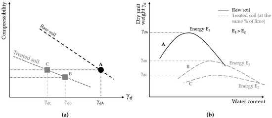Nocilla et al. (2022) proposal [2]: (a) compressibility of raw and treated soil versus dry unit weight; (b) compaction curves for raw and treated samples according to different energies.