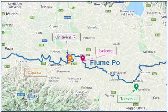 Mixtures were created as a combination of soil, lime, or cement and, for some of them, other additives such as super-plasticizing admixtures and expansive admix for controlled shrinkage. Different types of soils were used to prepare the flowable mixtures. In detail, the four soils used were collected from sites on embankments of the middle course of the Po River and its tributaries. In Figure 3, the sites of collection—Tassone, Chiavica Rossi, Caorso and Isolone—are localised. In the following section, the soils and additives used will be presented.