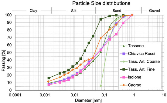 Each soil was dried and passed through an 850 μm sieve. From the soil Tassone, two particle size distributions were artificially created to investigate the influence of particle size distribution (finer or coarser) on the behaviour of the mixture. These two artificial gradings (Tassone Artificial Coarse and Tassone Artificial Fine) were obtained by separating the soil Tassone into its constituent particle size ranges and creating the artificial gradings by mixing soil from different sieve intervals in the proportion required for a specific coarser or finer grading; the resulting two particle size distributions were then checked through a further particle size analysis. Particle size distributions of the collected and artificial soils are shown in Figure 4.