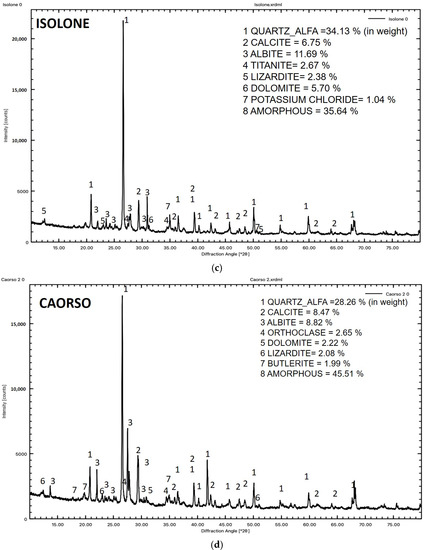 X-ray powder diffraction (XRD) mineralogy analyses using the PANalytical XPert Pro MPD Diffractometer. (a) Tassone; (b) Chiavica Rossi; (c) Isolone; (d) Caorso.